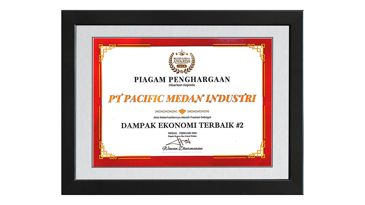 Award to PT Pacific Medan Industri as 2nd place for category Best Economic Impact from Custom Medan, February 2024