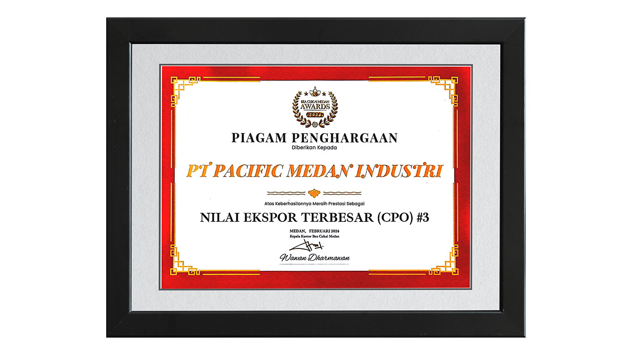 Award to PT Pacific Medan Industri as 3rd place for category of Largest export Value (CPO) from Custom Medan, February 2024